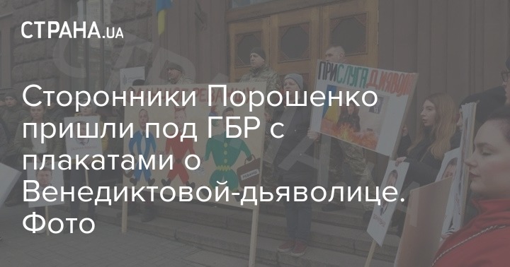 Он отмечает, что сегодня Порошенко пришло поддержать мало людей - обычно их гораздо больше. На ярких плакатах надписи о реванше со стороны новой власти, а также обвинения главы ГБР к причастности с нечистой силе в лице президента России Владимира Путина.