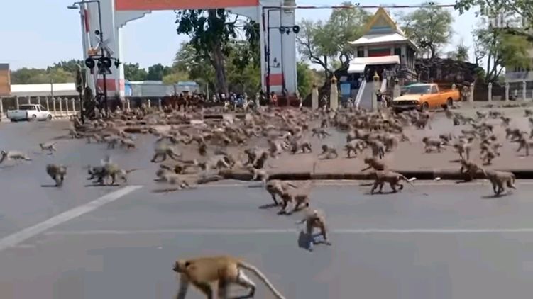 Сокращение числа туристов на фоне вспышки Covid-19 привело к тому, что приматы постоянно голодают. Жители Лопбури сняли момент, как большая толпа обезьян устроила свалку из-за кастрюли с йогуртом прямо на проезжей части.