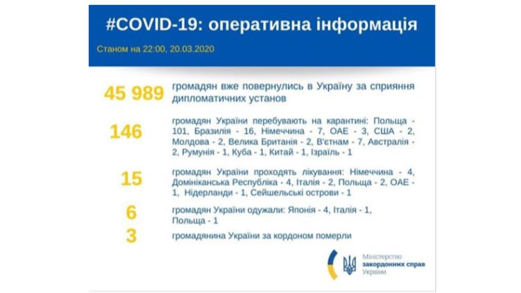 Трое наших земляков скончались, а на карантине за границей находятся 146 украинцев. Из них 101 - в Польше, 16 - в Бразилии, по 7 - в Германии и Вьетнаме, 3 - в ОАЭ, по 2 в США, Австралии, Молдове и Великобритании, по одному - в Румынии, на Кубе, в Китае и Израиле.