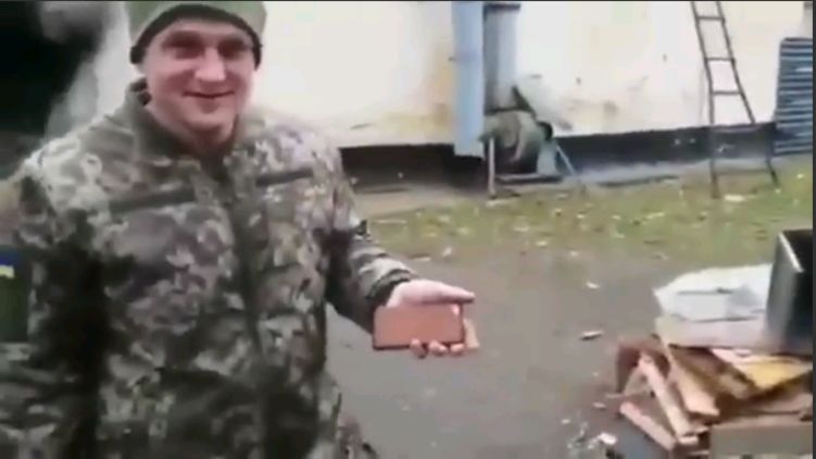Когда он положил телефон на пенек для колки дров, солдат запротестовал, сказав, что смартфон Lenovo обошелся ему в три "штуки" (тысячи гривен). На это офицер ответил: "Сейчас это будет шесть штук".