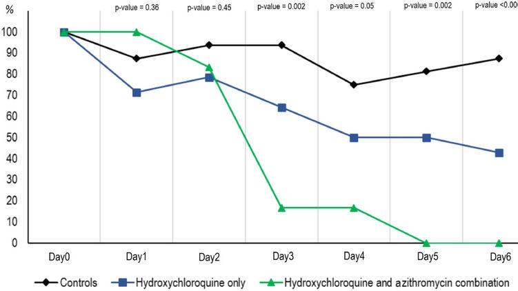 Оставшиеся 14 пациентов в течение десяти дней принимали перорально 200 миллиграмм сульфата гидроксихлорохина три раза в день. Шестеро из них, помимо гидроксихлорохина, получали для предотвращения суперинфекции первые два дня по 500 миллиграмм азитромицина в день, а затем в течение четырех дней — по 250 миллиграмм. Все шестеро пациентов хорошо переносили комбинацию гидроксихлорохина и азитромицина. Ежедневно им делали электрокардиограмму для контроля отсутствия побочных эффектов на сердце.