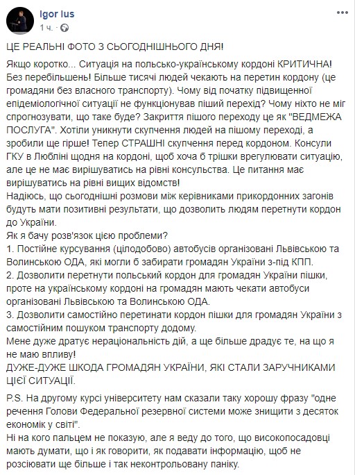 "Если коротко... Ситуация на польско-украинской границе критическая! Без преувеличений! Более тысячи людей ждут пересечения границы (это граждане без собственного транспорта). Почему с начала повышенной эпидемиологической ситуации не функционировал пеший переход? Почему никто не мог спрогнозировать, что такое будет? Закрытие пешего перехода это как "Медвежья услуга". Хотели избежать скопления людей на пешем переходе, а сделали еще хуже! Теперь страшные скопления перед границей. Консулы ГКУ в Люблине ежедневно на границе, чтобы хотя бы немного урегулировать ситуацию, но это не должно решаться на уровне консульства. Этот вопрос должен решаться на уровне высших ведомств!", - написал он.
