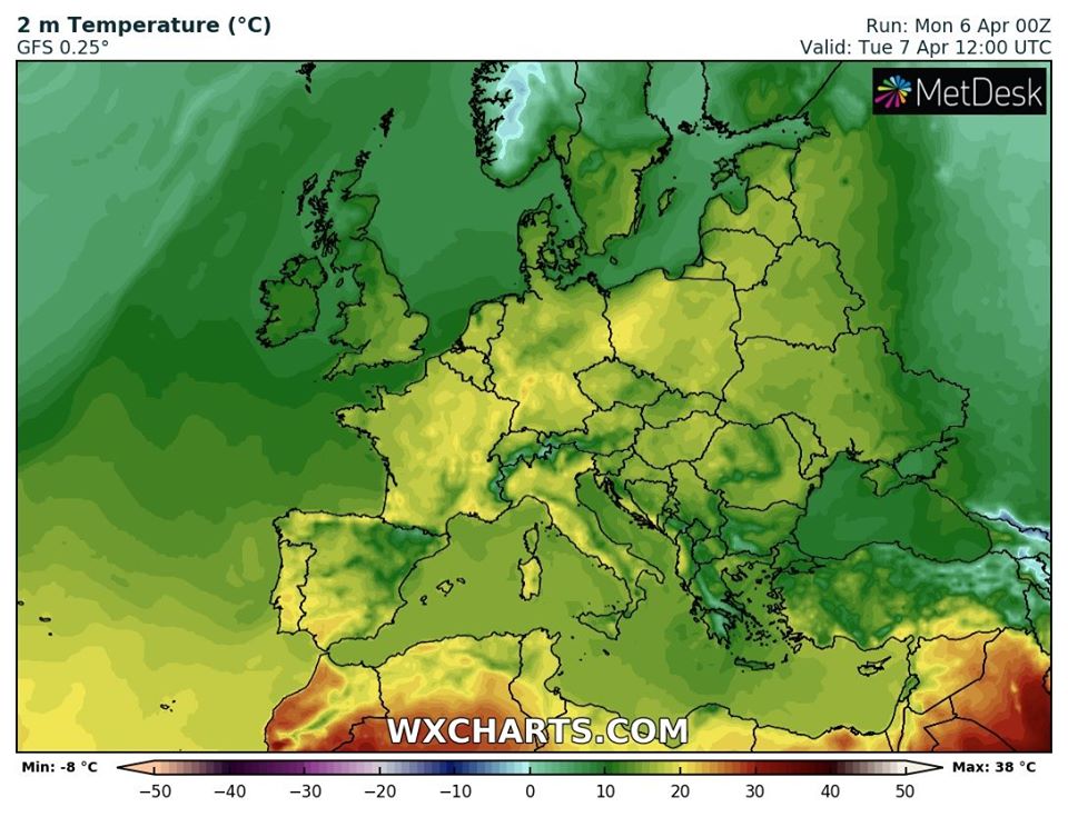 Температура воздуха в Европе высшей окажется на континентальной части. Потому север традиционно холоднее, а юг Европы будет обдувать прохладный воздух непрогретых с зимы морей.