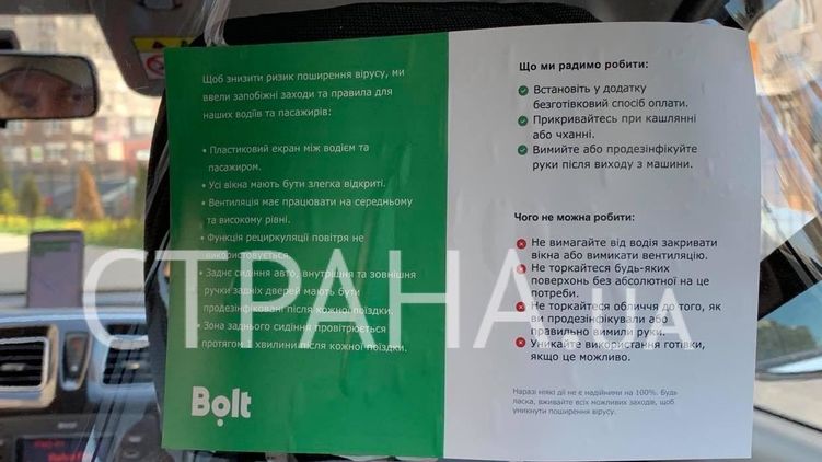 Также в "изолированных" такси присутствуют памятки о мерах предосторожности во время разгула Covid-19 в Украине. Компания советует пассажирам установить в приложении вызова такси безналичный опыт оплаты, прикрываться при чихании или кашле и дезинфицировать руки после выхода из автомобиля.
