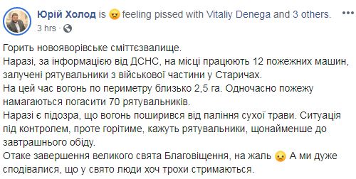 "Ситуация под контролем, но пожарные говорят, что будет гореть как минимум до завтрашнего обеда", – написал Юрий Холод.