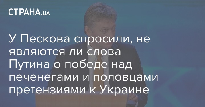 На вопрос журналиста о том, можно ли воспринимать слова Путина, как территориальные претензии, если учесть, что и половцы, и печенеги терзали территорию, которая сейчас принадлежит Украине - Киев и Чернигов, Песков ответил: "Не забывайте, что территория, на которой находится Украина, исторически была Киевской Русью. Киевскую Русь вы же никуда не денете?".