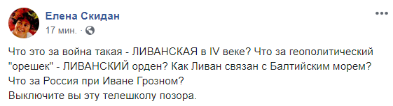 "Что за геополитический "орешек" - Ливанский орден? Как Ливан связан с Балтийским морем? Что за Россия при Иване Грозном? Выключите вы эту телешколу позора", - пишет Скидан.
