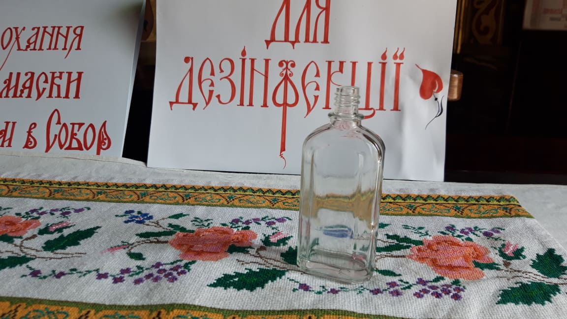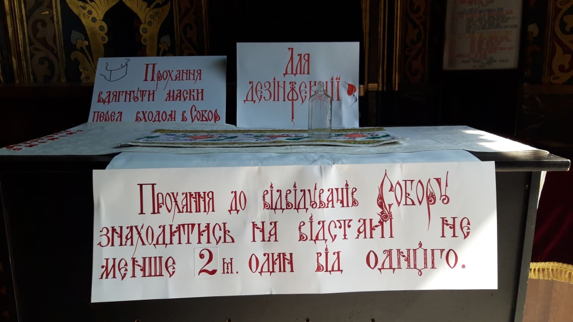Владимирский собор в Киеве также работал в обычном режиме. Перед входом было предупреждение, что расстояние между посетителями должно быть не менее двух метров, а также нужно надеть защитную маску. Стоял столик с флаконом антисептика, правда, само средство закончилось.