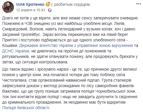 "Прекратите наконец-то врать! Что вы якобы контролируете ситуацию. О каком "горении травяного настила, камыша и лесной подстилки отдельными очагами" вы твердите?! Сейчас ситуация неконтролируемая - она критична. От всего сердца спасибо пожарным и спасателям! Спасибо так же, как в 1986 году!" — написала Дегтяренко в Facebook.