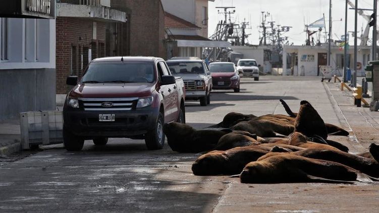 На асфальт пустого города в Аргентине из моря вышли осмелевшие львы. Фото