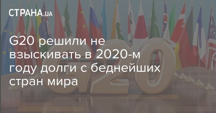 Страны Большой двадцатки договорились временно прекратить взимание долгов с бедных государств мира. Приостановление платежей по обслуживанию долгов для беднейших стран связано с коронавирусом. Оно вступит в силу 1 мая и продлится до конца 2020 года.
