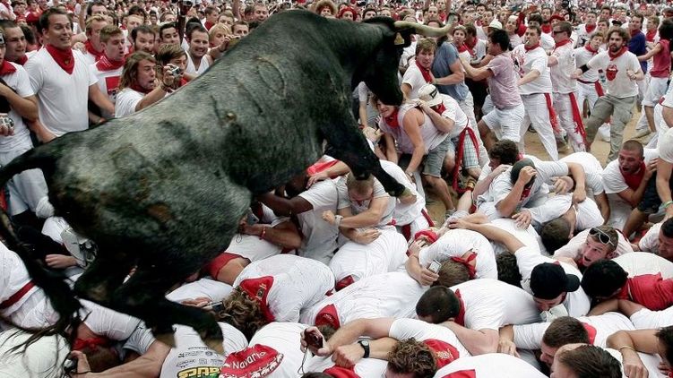 Во время забега толпа людей убегает по узкой улочке от разъяренных быков. В завершение фиесты также проходят традиционные схватки быков с тореадорами.