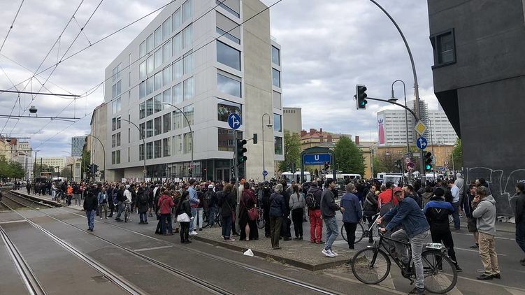 Протестующие собрались в центре города, у театра "Фольксбюне" на площади Розы Люксембург. Акция не санкционированная. После ее начала полиция начала выставлять заграждения на подходах к площади, чтобы не допустить притока новых протестующих.