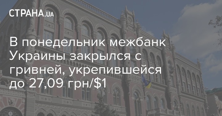 Курс гривни на межбанковском валютном рынке в понедельник укрепился до 27,09 грн/$1 с 27,12 грн/$1 в предыдущий рабочий день