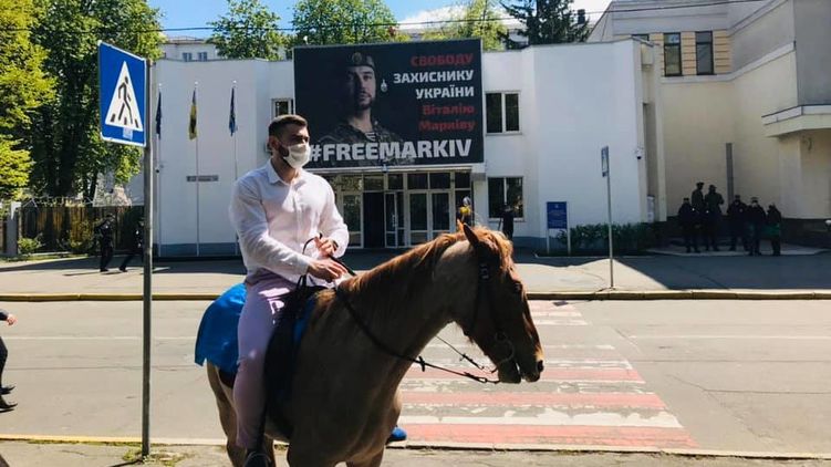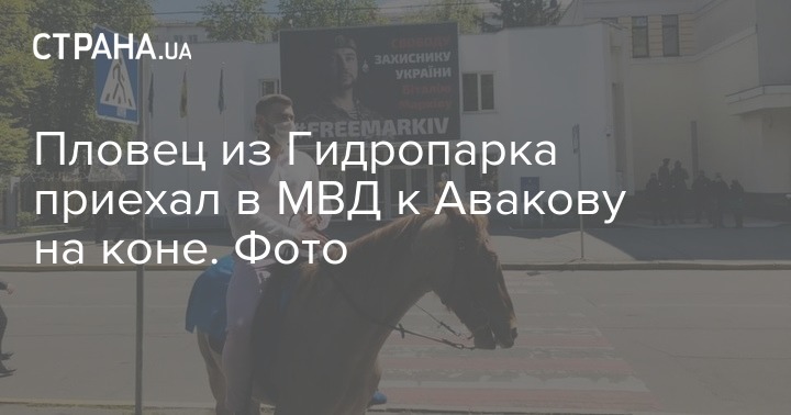 Задержанный ранее полицией при попытке попасть в столичный Гидропарк Валентин Бурьянов приехал к зданию МВД, чтобы передать обращение к министру Арсену Авакову на лошади.