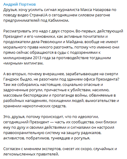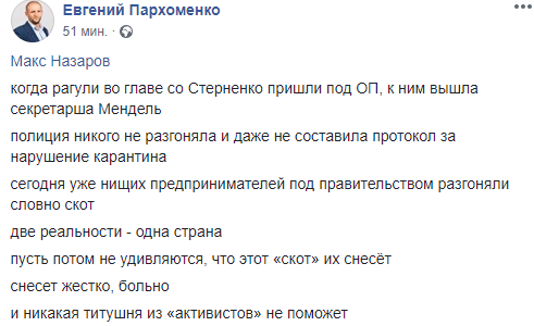 "Когда рагули во главе со Стерненко пришли под ОП, к ним вышла секретарша Мендель. Полиция никого не разгоняла и даже не составила протокол за нарушение карантина. Сегодня уже нищих предпринимателей под правительством разгоняли словно скот