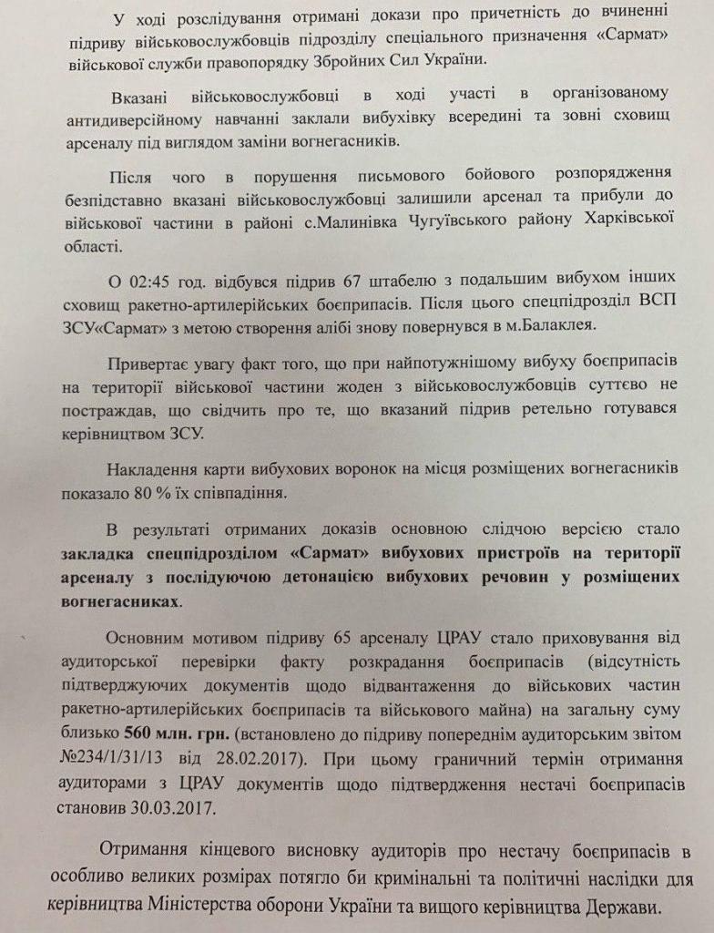 В документе говорится, что основным мотивом подрыва 65-го арсенала стало сокрытие от аудиторской проверки факта хищения боеприпасов на общую сумму около 560 млн грн. К 30 марта 2017 года аудиторам должны были предоставить объяснения и документы по этому поводу, но 23 марта 2017-го арсенал взорвался.