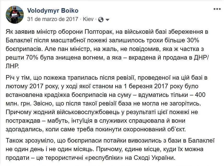 О ней писал, в частности, журналист Владимир Бойко. Он отметил, что пожар по странному стечению обстоятельств произошел после ревизии, проведенной в марте 2017 года. Она выявила воровство боеприпасов на сумму 400 млн грн.