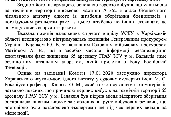 Это опровергает версию о подрыве арсенала при помощи прилетевшего с территории России беспилотника. В выводе комиссии говорится, что есть основания полагать, что подрыв самого большого арсенала нашего государства "мог произойти из-за умышленных спланированных действий виновных лиц, действовавших в течение определенного времени в условиях очевидности для военнослужащих и работников 65-го арсенала ГРАУ ВСУ".