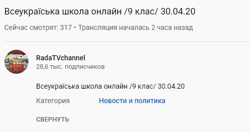 Как видно на скриншоте, канал подписал трансляцию "Всеукраинская школа онлайн / 9 класс / 30.04.20". Аналогичная надпись стоит и в описании к видео.