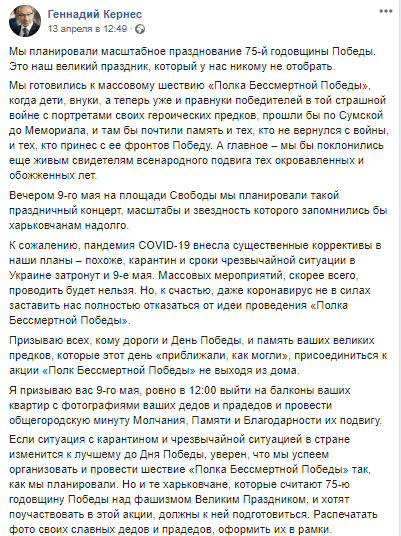 Практически такие же рекомендации жителям дал мэр Днепра Борис Филатов. Он сообщил, что в этом году День победы в городе отметят онлайн в связи с карантином. Об этом он написал в в Facebook.