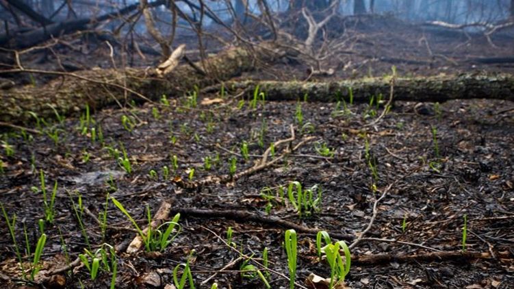 После масштабных пожаров в зоне отчуждения Чернобыльской АЭС там появились первые признаки восстановления природы. На выжженной земле уже растет молодая трава.