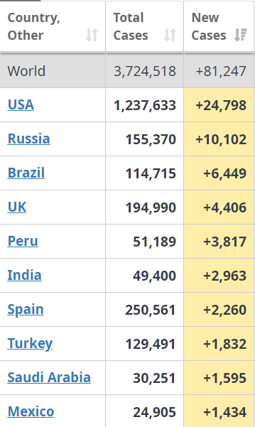 07:30  Первая десятка стран по заболеваемости коронавирусом за 5 мая.