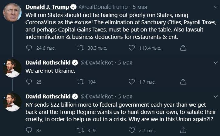 На это Ротшильд ответил президенту: "Мы не Украина". И добавил, что штат Нью-Йорк, подконтрольный демократам, платит в федеральный бюджет больше, чем получает назад.
