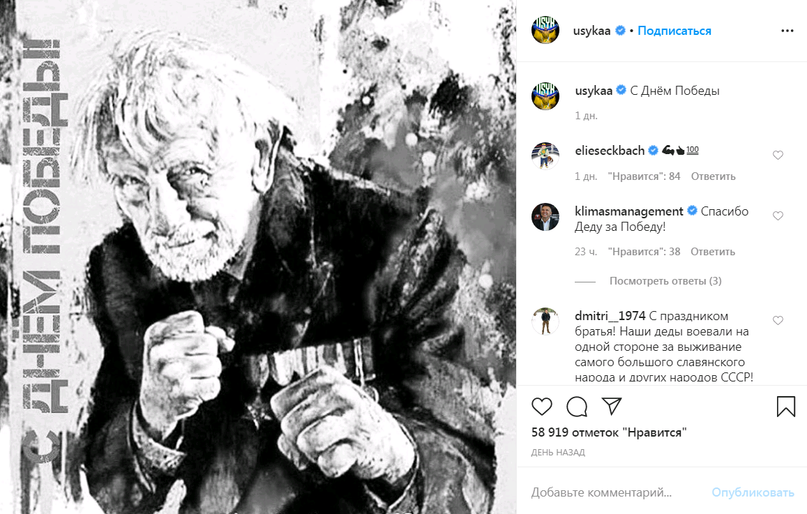 Украинские боксеры и многократные чемпионы мира Василий Ломаченко и Александр Усик в Instagram поздравили подписчиков и читателей с 9 Мая.