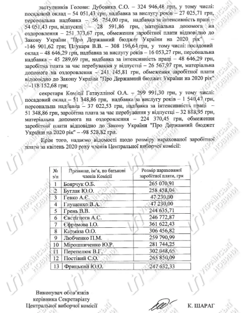 Заместитель председателя ЦИК Сергей Дубовик мог заработать 472 000 грн, однако из-за ограничения зарплаты на 147 000 гривен, или 31,1%, ему было начислено 325 000 грн: 251 400 грн матпомощи, 28 600 грн отпускных и 45 000 грн оклада и премий.