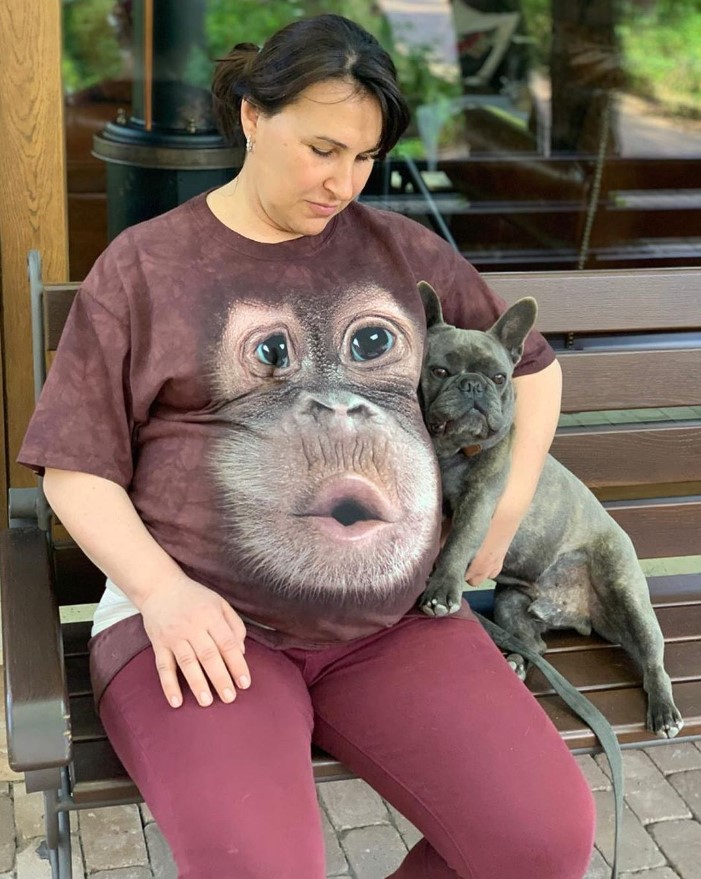 На фотографии супруга Ляшко сидит на лавочке вместе со своей собакой. На ней надета футболка с трехмерным рисунком гориллы.