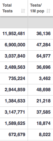 Россия занимает второе место в мире по общему количеству проведенных тестов на коронавирус. В таблице в первом столбце показано общее количество проведенных тестов, во втором - число на 1 миллион населения.