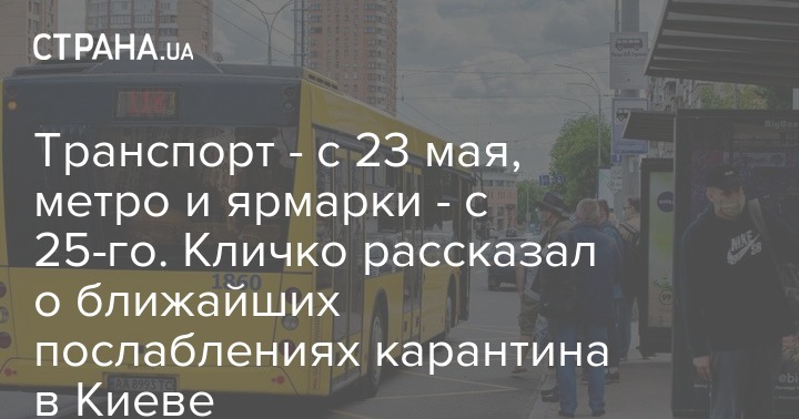 Транспорт - с 23 мая, метро и ярмарки - с 25-го. Кличко рассказал о ближайших послаблениях карантина в Киеве