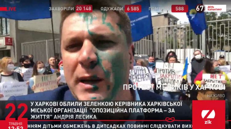 Неизвестные в Харькове облили зеленкой главу городского отделения "Оппозиционной платформы - За жизнь" Андрея Лесика во время того как он поддержал акцию медиков.