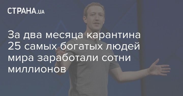 Больше других разбогател на пике пандемии основатель соцсети Facebook Марк Цукерберг. За последние два месяца акции Fаcebook поднялись в цене примерно на 60%. Его активы подорожали на 31 миллиард долларов. Сейчас его состояние оценивается в 86,5 млрд долларов. Цукерберг переместился с седьмого места в списке богатейших людей планеты, которое он занимал в апреле, на четвертое.