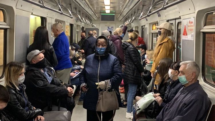 На третий день работы метро Киева в нем увеличилось число пассажиров. Дистанцию никто не соблюдает