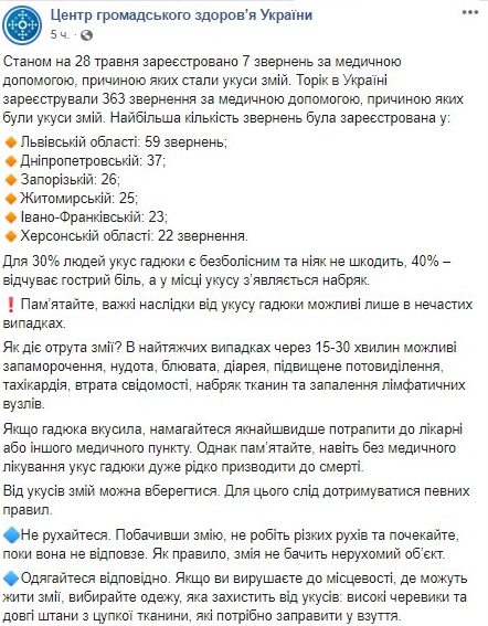"По состоянию на 28 мая зарегистрированы 7 обращений за медицинской помощью, причиной которых стали укусы змей. В прошлом году в Украине зарегистрировали 363 обращения за медицинской помощью, причиной которых были укусы змей", - указано в сообщении.