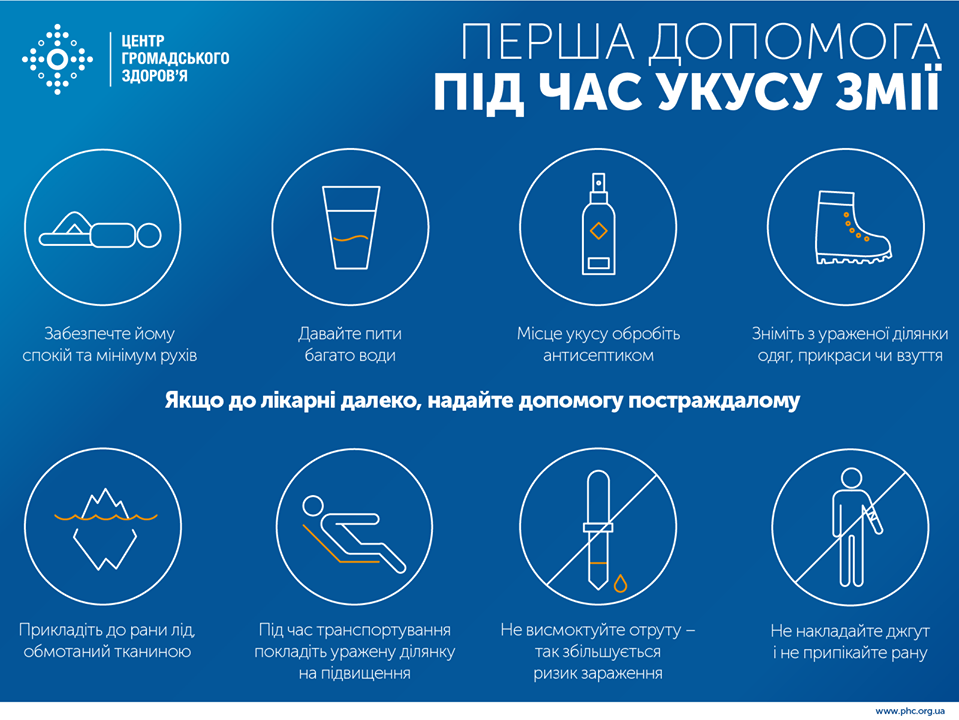 Напомним, что нужно делать в случае укуса змеи. В Украине умереть от укуса змеи практически невозможно, поскольку в нашем регионе не распространены ядовитые виды змей, кроме гадюки обыкновенной и гадюки степной. Правда, в домашних условиях некоторые любители рептилий содержат и более опасных ядовитых змей (кобры, эфы и гремучие змеи).