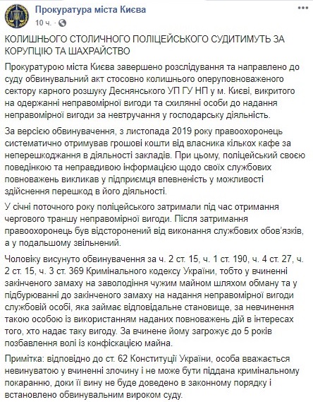 "Прокуратурой города Киева завершено расследование и направлено в суд обвинительный акт в отношении бывшего оперуполномоченного сектора уголовного розыска Деснянского УП ГУ ЧП в г. Киеве, уличенного в получении неправомерной выгоды и преклонении лица к предоставлению неправомерной выгоды за невмешательство в хозяйственную деятельность", - указано в сообщении.