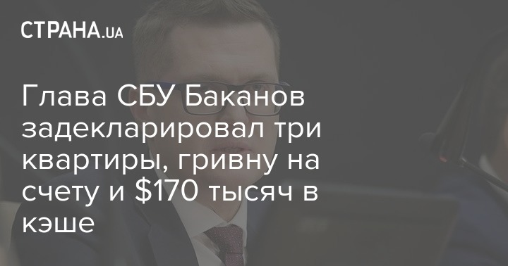 Кроме того, Баканов указал денежные активы в банках: 1 грн, 233 евро и 16 долларов в "ПриватБанке" и 418 грн в коммерческом банке "Глобус". Наличными он хранит 170 тысяч долларов.