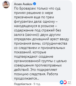 "По Броварам: суд принял решение о мере пресечения еще трем фигурантам дела: одному - находящемуся в розыске - содержание под стражей без залога (заочно); двум другим определен домашний арест ввиду признания вины, сотрудничества со следствием и признательных показаний, которые подтверждают создание организованной группы с целью совершения противоправных действий. Это подкрепляет позицию следствия. Работа продолжается", - написал Аваков.