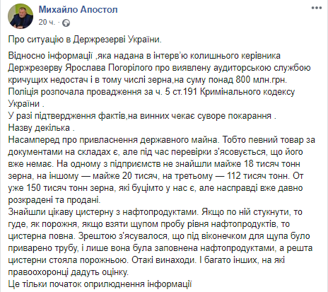 "Относительно информации, предоставленной в интервью бывшего руководителя Госрезерва Ярослава Погорелого об обнаруженной аудиторской службой кричащей недостаче, в том числе зерна на сумму более 800 млн.грн. Полиция начала производство по ч. 5 ст.191 Уголовного кодекса Украины. В случае подтверждения фактов, виновных ждет суровое наказание.