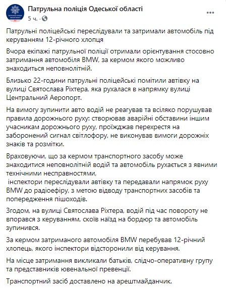 В Одессе 12-летний подросток убегал от патрульных на BMW. Фото: Facebook