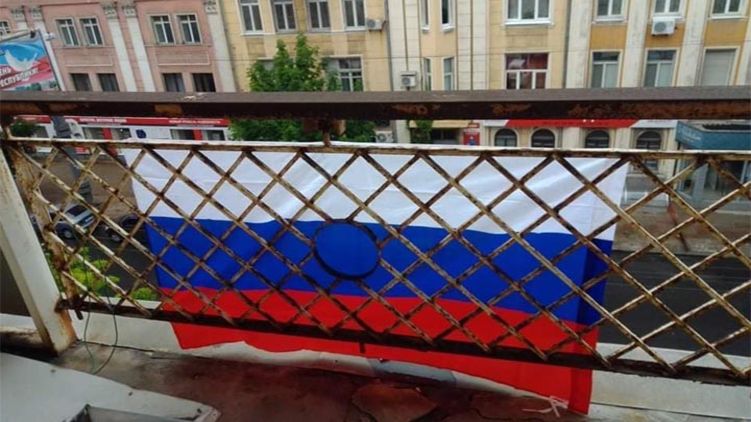 Российский флаг на балконе квартиры задержанной женщины. Фото: mariupol-express.com.ua
