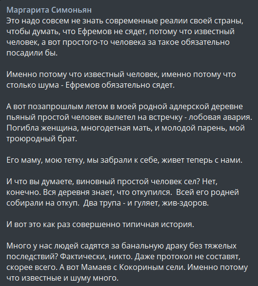 "Это надо совсем не знать современные реалии своей страны, чтобы думать, что Ефремов не сядет, потому что известный человек, а вот простого-то человека за такое обязательно посадили бы. Именно потому что известный человек, именно потому что столько шума - Ефремов обязательно сядет", - сказала она и привела пример футболистов Кокорина и Мамаева.