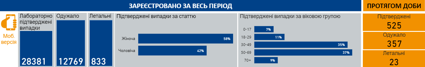 За сутки в стране зафиксировано 525 новых случаев заражений. Всего за сутки в Украине умерло 23 человека, а выздоровело - 357 пациентов, как передает пресс-служба ЦОЗ.
