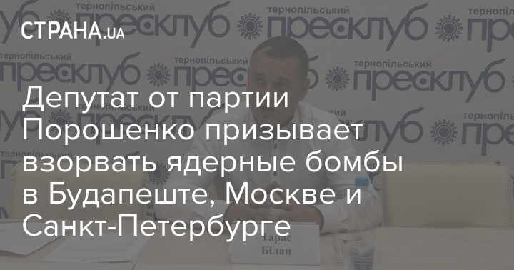Депутат Тернопольского горсовета от партии Петра Порошенко "Солидарность" Тарас Билан обнародовал в своем Фейсбуке обращение к Зеленскому, в котором предложил взорвать ядерные бомбы в Будапеште, Москве и Санкт-Петербурге, чтобы "защититься от нападения Венгрии и России".