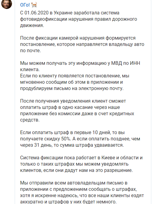 "Система фиксации пока работает в Киеве и области, и только о таких штрафах мы можем уведомлять клиентов, если они дадут нам на это разрешение. Мы отправили всем автовладельцам письмо в приложении с предложением сообщать о штрафах, хотя я искренне надеюсь, что все наши клиенты ездят аккуратно и штрафов у них будет немного", – написал сооснователь monobank.