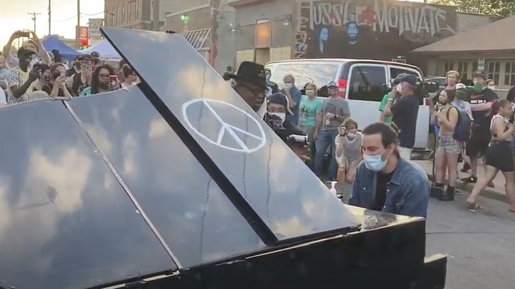 Музыкант, который передвигается на велосипеде с роялем на металлической конструкции с колесами,  появился в Миннеаполисе (с него и начался "Черный майдан"), где дал уличный концерт в память о погибшем темнокожем Джордже Флойде.