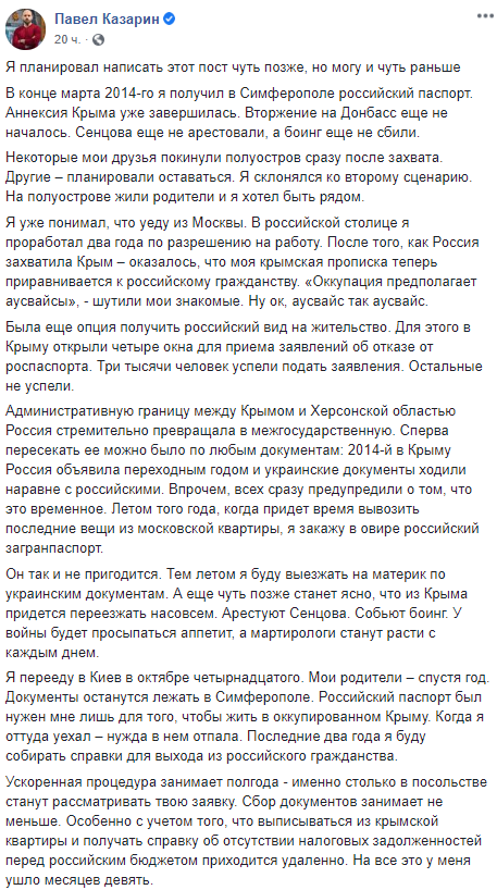 "После того как Россия захватила Крым – оказалось, что моя крымская прописка теперь приравнивается к российскому гражданству. "Оккупация предполагает аусвайсы", - шутили мои знакомые. Ну ок, аусвайс так аусвайс", - пояснил Казарин.